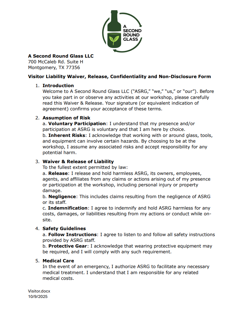 A Second Round Glass LLC Liability Waiver, we will have copies for you to sign on site… Please Read Over.